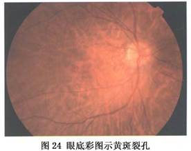 影响术后视力恢复的常见眼底改变有:A.糖尿病视网膜病变(图20);B.高度近视眼底病变(图21);C.老年性黄斑病变(图22);D.黄斑裂孔(图23);E.视网膜中央静脉阻塞(图24);F.缺血性视神经病变(图25);G.视网膜脱离(图26)